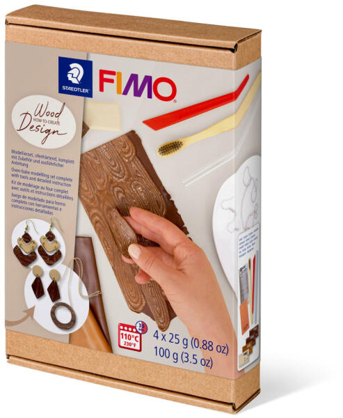 Ebben a szettben 4 darab 25 grammos süthető gyurmatéglát találsz a FIMO Soft sorozatból. Valamint a készlet tartalmaz egy műanyag formázópálcát , egy műanyag sodróhengert és egy kefét , amivel az élethű fa textúrát tudod kialakítani a felületen. A szettben található eszközökkel és a részletes leírással egy olyan technikát sajátíthatsz el, amivel valódi, természetes faerezetű ékszereket, apró tárgyakat készíthetsz. Ez a kis készlet remek kiindulópontja lehet a kísérletezésnek , a süthető gyurmával való ismerkedésnek. A színek mindegyike elérhető a normál, 57 grammos méretben is, így a kedvenc árnyalatok könnyen beszerezhetők utólag is, további ötletek megvalósításához. Kezdőknek, hobbiművészeknek tökéletes választás.