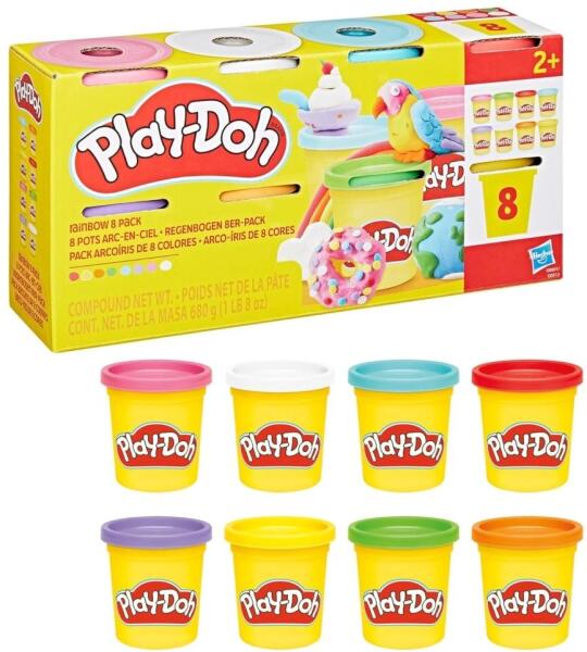 - 8 tégely színes Play-Doh gyurma- egy tégely tartalma: 85 g- szivárvány színek- nem mérgező, biztonságos alapanyagból készült- újrahasználható, zárható tégelyek a hosszan tartó frissességért