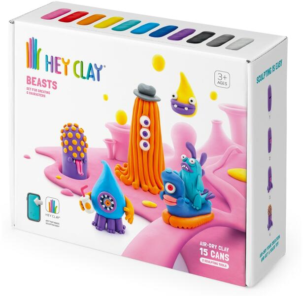 A Hey Clay gyurma egy szuper újdonság a kreativitás kibontakoztatására!  Engedd szabadjára a fantáziád és készíts szuper színes és különleges figurákat! Az alkotásban egy applikáció is segítségedre lesz, melyben lépésről-lépésre haladva láthatod az űrlények, szörnyek, dinoszauruszok és madarak összeállítását. A könnyen formálható, rendkívül puha anyag a levegőn 24 óra elteltével megszilárdul, így az elkészült figurákkal a későbbiekben játszani is tudsz. A gyurma nem ragad, nem hagy foltot a ruhán és biológiailag lebomló anyagból készül. Ismerkedj meg a világ legviccesebb bestiáival a Hey Clay gyurmakészlet - Bestiák nagy szett segítségével. Azt hiszik, bárkit megijesztenek, de nézd csak meg őket, Cseppike olyan aranyos a pohárban lévő italával, Fishka úgy néz ki, mintha ő maga ijedt volna meg valamitől, Vöröske hajvágásra szorul, Lilla most kapott narancssárga kiütést, Bogárka kicsit egy kacsára hajaz, Yollo pedig csak arra vár, hogy valakire "huuuuuuu"-t kiáltson. A készlet 15 doboz puha, kreatív gyurmát és egy hozzáférési kódot tartalmaz az alkalmazásba a megvásárolt karaktersorozathoz. A csomagolásban található színek lehetővé teszik a készlet mind a 6 karakterének megalkotását. A gyurma egy része újra felhasználható marad, így megvalósíthatod saját kreatív ötletedet.